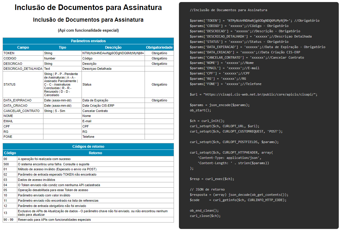 Exemplo de API para Inclusão de Documentos para Assinatura: