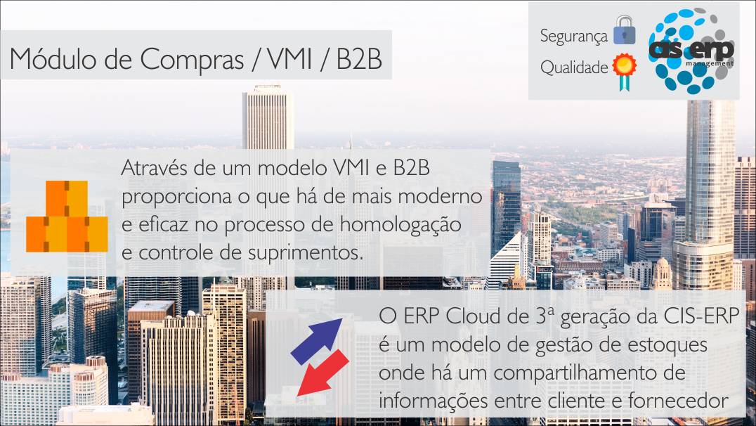 O módulo de Compras VMI do ERP Cloud de 3ª geração da CIS-ERP é um modelo de gestão de estoques onde há um compartilhamento de informações entre cliente e fornecedor. O cliente disponibilizará informações reais de seus estoques e de sua previsão de demanda, cabendo ao fornecedor a gestão das entregas. Neste modelo não existirão mais pedidos de compra, as quais passam a ser de responsabilidade do fornecedor. Com o sistema de gestão CIS-ERP os estoques passam a ser repostos em períodos menores e de forma automática, pelo fornecedor, para manter o atendimento à demanda do cliente. No VMI, ao contrário do modelo consignado, a emissão da fatura de venda ocorre em conjunto com a entrega do material ao cliente.