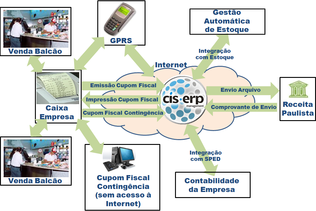 No CIS-ERP os balconistas e os caixas acessam o ERP em nuvem através de uma simples conexão com a Internet (com qualquer tipo de equipamento e em qualquer sistema operacional) ou através de nosso modem com transmissão GPRS e em um ambiente seguro consulta estoque, preço de venda e demais dados necessários. A reserva do estoque é feita de forma eletrônica e estará disponível para o caixa. Após a confirmação do pagamento (dentro do mesmo dia) o sistema baixa a reserva e acerta o estoque. As NFCe's são então transmitidos em blocos para a receita estadual e integram o SPED/Contabilidade.