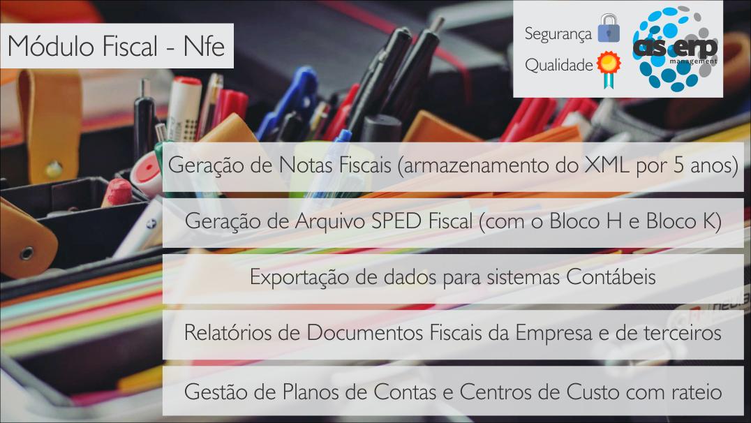 O sistema de gestão CIS-ERP recebe os arquivos das NFe's dos fornecedores (XML) e automaticamente faz a entrada destes documentos no sistema. Todos os tipos de Notas Fiscais eletrônicas disponíveis no mercado são reconhecidas: NF de Venda, Beneficiamento e Industrialização, Importação, Exportação, Entrada, Serviço, Simples Remessa, Remessa para Conserto, Carta de Correção, Contingência, dentre tantas outras.